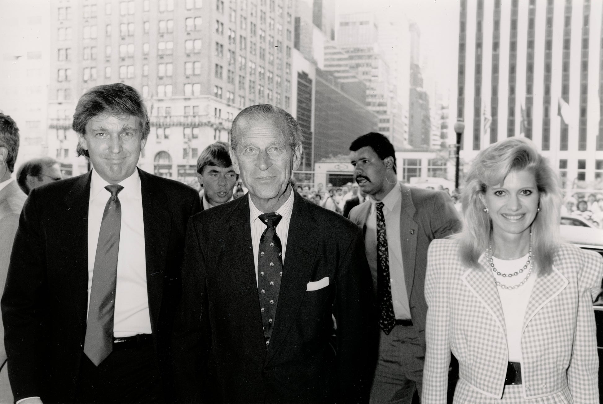 DONALD TRUMP AND HIS WIFE IVANA GREET PRINCE PHILIP AS HE ARRIVES AT THE PLAZA HOTEL IN NEW YORK.