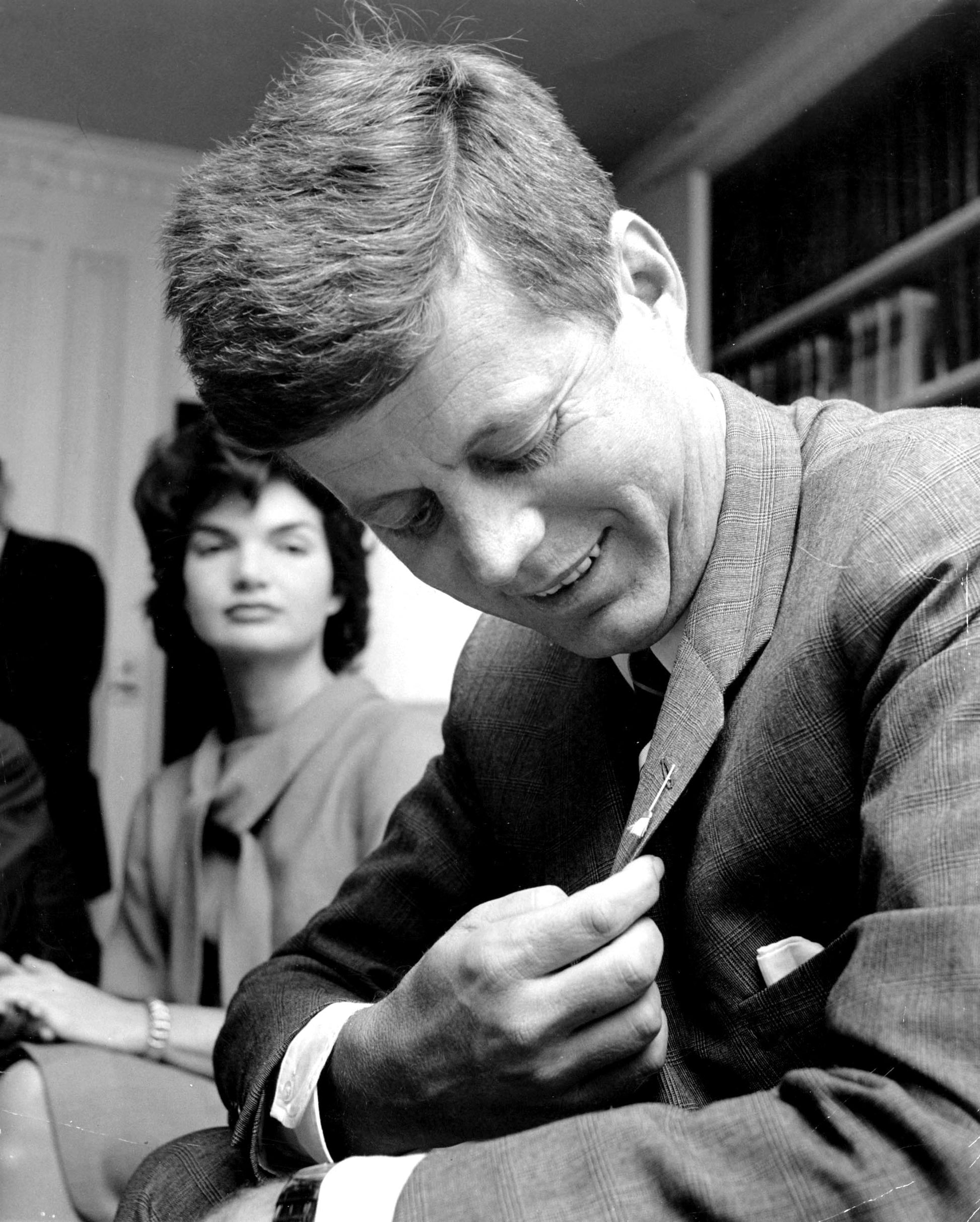 March 1, 1958, Santa Monica, California. Admiring a pin in the form of a broom, symbolic of Democratic hopes for a "clean sweep" in the 1958 elections, Senator John Kennedy (D-Massachusetts) is shown at a press conference.