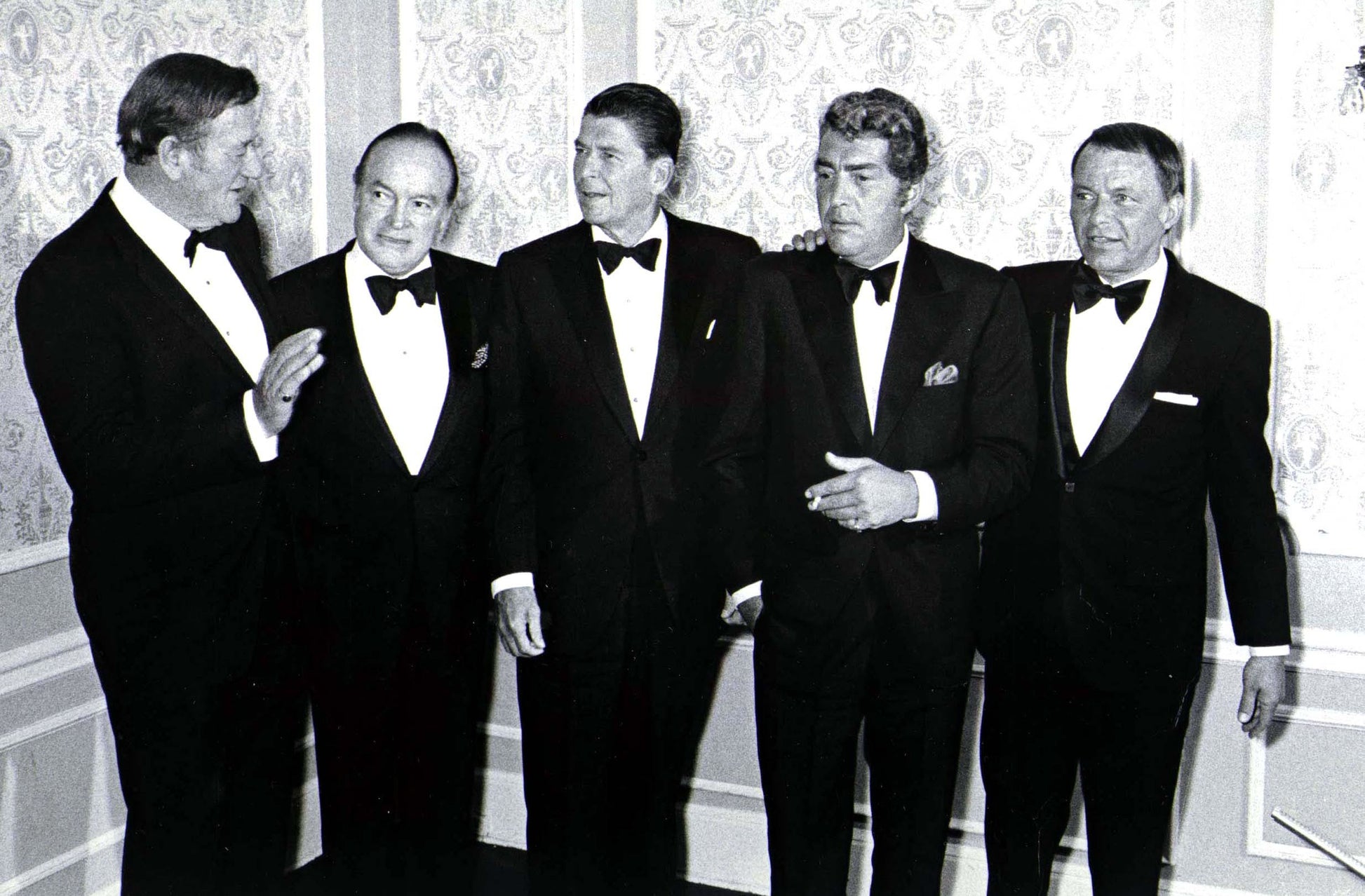 Group Photo Of John Wayne, Bob Hope, Ronald Reagan, Dean Martin And Frank Sinatra Attending A Black Tie Event